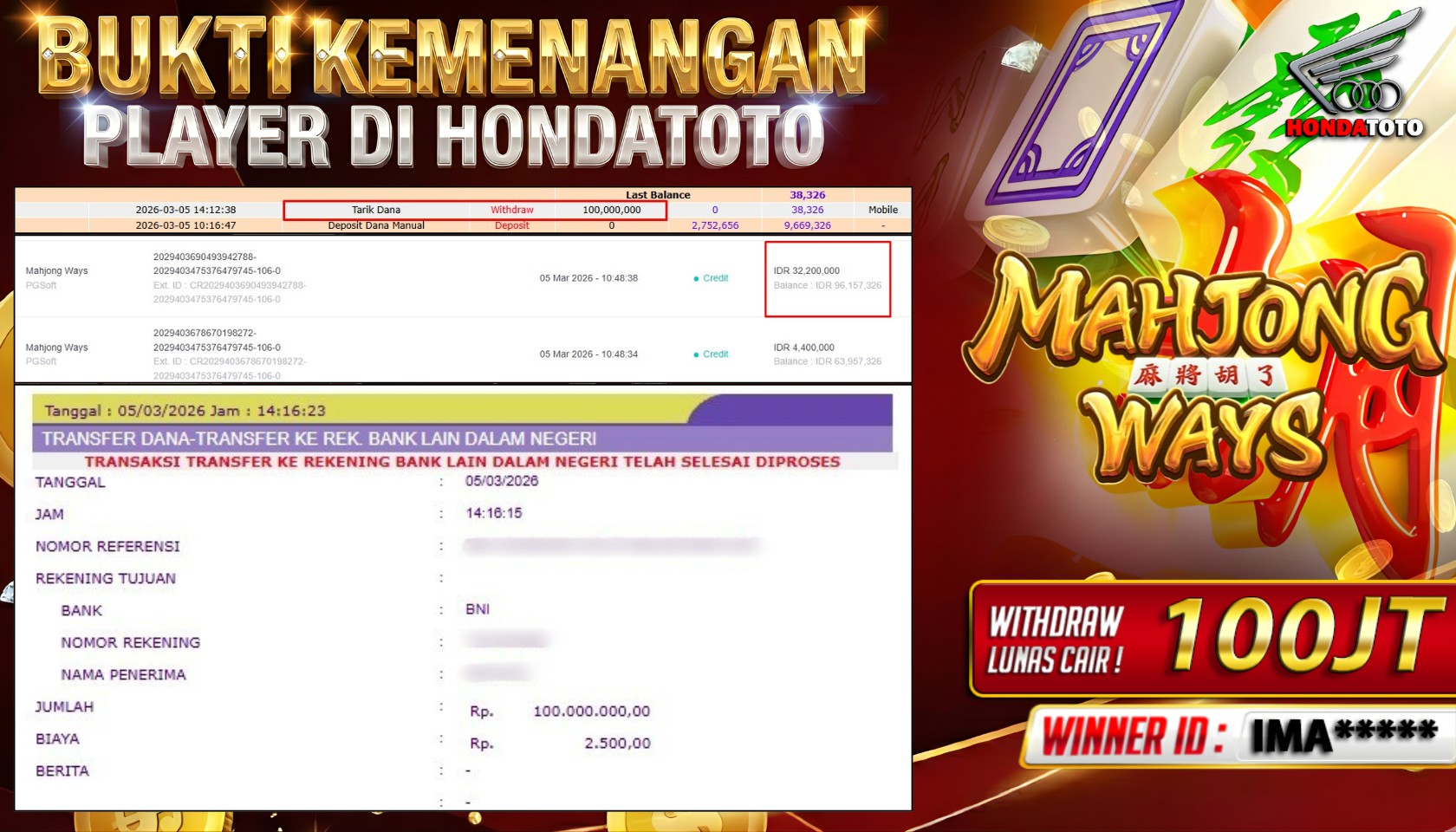 engan cara transfer ke rekening tujuan yang sudah di daftarkan pada situs togel online kami, Pembayaran hanya dapat di proses jika rekening yang di daftarkan telah valid dan dapat di transfer. Semua kemenangan member yang mendapatkan hadiah jackpot terbesar akan kami posting agar semua pemain dapat melihat bandar situs terpercaya HONDATOTO ini membayar semua kemenangan member hingga lunas. Setiap postingan yang kami posting akan kami lakukan sensor pada nomor rekening 4 digit dan nama rekening untuk menjaga privasi dan kerahasiaan member. Postingan Jackpot yang kami posting agar member atau pemain yang belum pernah bermain bisa melihat bandar togel Bukan Kaleng Kaleng Seperti HONDATOTO ini, Semua postingan jackpot yang kami posting dapat di lihat data keasliannya melalui nomor reff yang di tunjukan pada bank atau mbanking saat kita melakukan transfer.