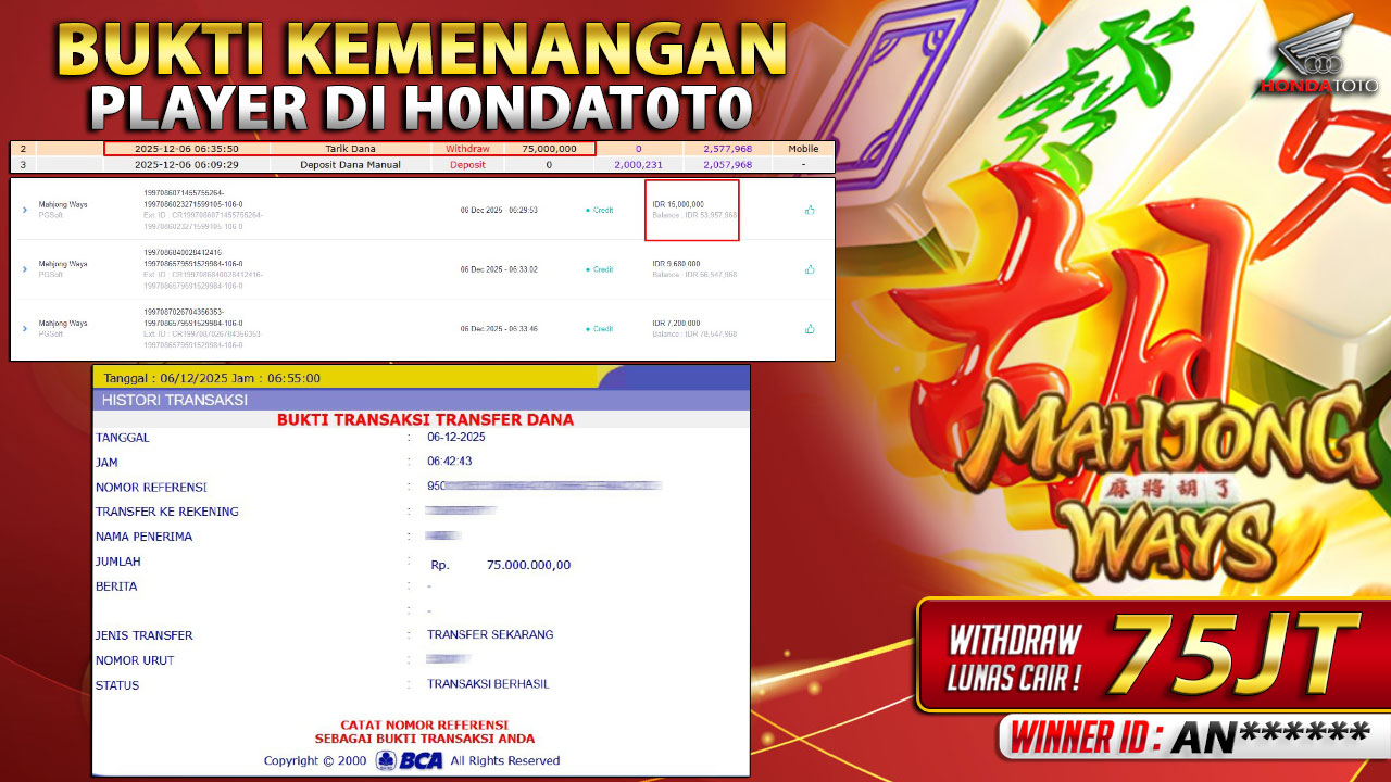 Bukti Kemenangan 06 DESEMBER 2025 Di PG SOFT MAHJONG WAYS WD 75 Juta